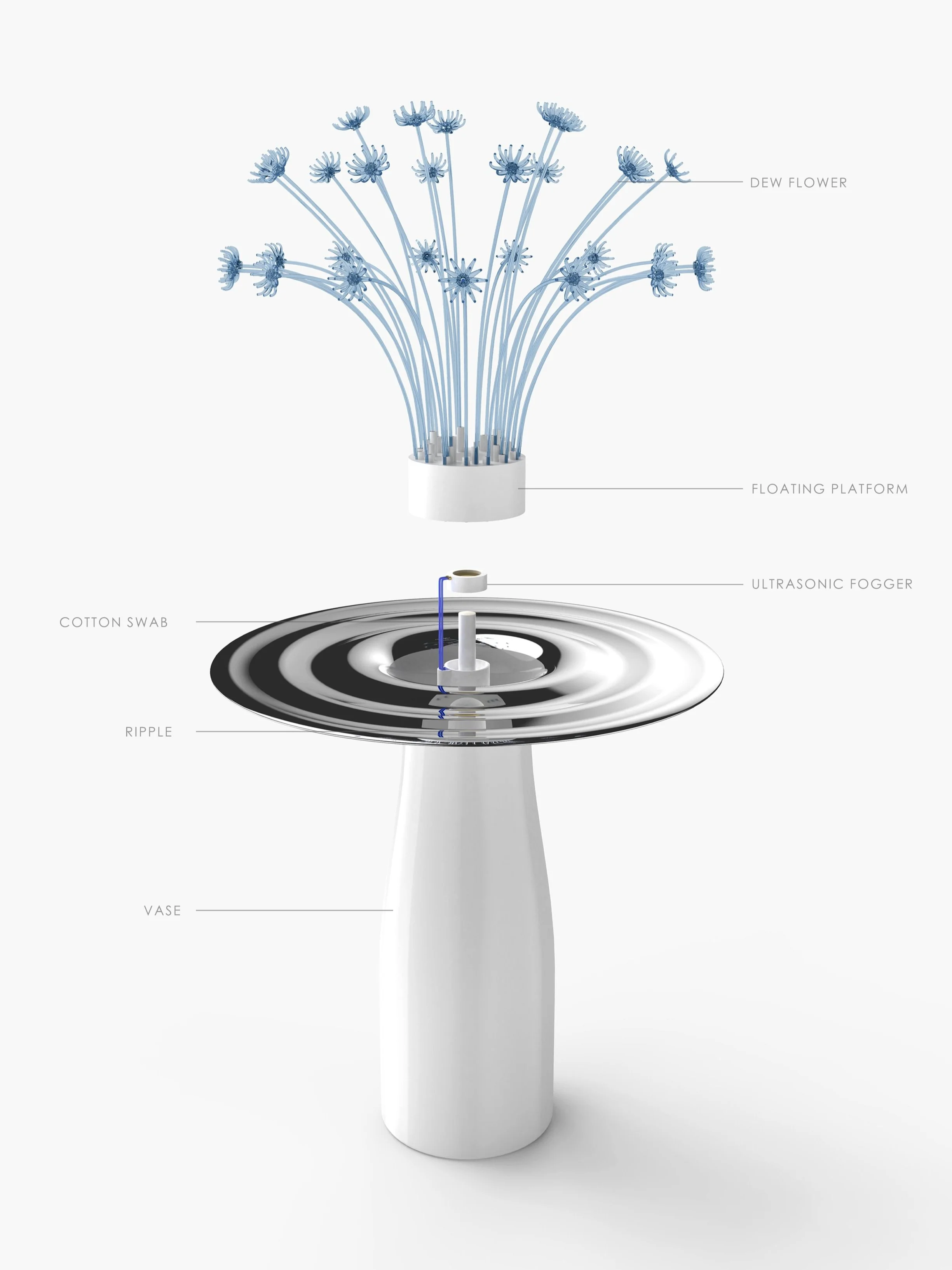 In designing this humidifier, I drew inspiration from the natural water cycle. It simulates the sublimation and condensation of water vapor in nature. In this device, tiny droplets are heated and turned into steam, which slowly rises and eventually condenses on the suspended crystal petals. These crystal petals not only capture the droplets but also cleverly utilize their refractive effects to reveal the elusive beauty of water's flow and transformation.